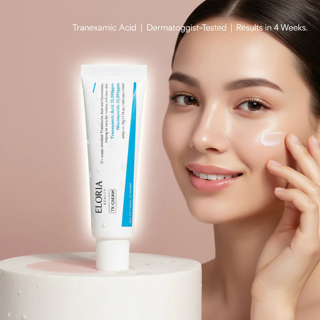 Clinically inspired and gentle enough for all skin types, TX Cream uses dermatologist-backed Tranexamic Acid to fade dark spots, even skin tone, and restore your natural glow — without irritation.